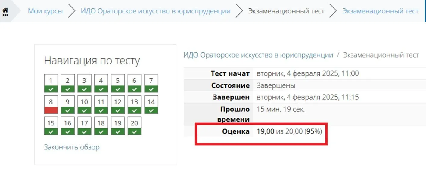 Последний раз тест был сдан на результат 19,00 из 20,00 (95%)