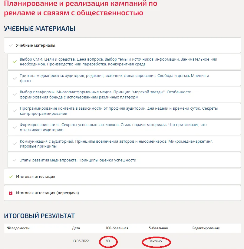 Выбор СМИ. Цели и средства. Цена вопроса. Выбор темы и источников информации. Занимательное или необходимое. Производство или переработка. Конкурентная среда Три кита медиапроекта: аудитория, редакция, источник финансирования. Свобода и догма. Мнения и факты Выбор платформы. Многоплатформенные медиа. Принцип "морской звезды". Особенности формирования бренда с использованием различных платформ Программирование контента в зависимости от профиля аудитории, дня недели и времени суток. Секреты контрпрограммирования Формирование стиля. Секреты успешных заголовков. Стиль подачи материала. Что притягивает, что отталкивает аудиторию Коммуникация с аудиторией. Принципы вовлечения авторов и ньюсмейкеров. Микромедиамаркетинг. Игровые принципы Этапы развития медиапроекта. Принципы оценки успешности Итоговая аттестация